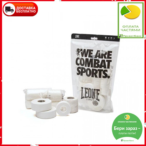 Набор для профессиональной тапировки Leone был создан в сотрудничестве с Федерико Катизоне, президентом Международной ассоциации Cutman (катменов). Благодаря своему большому опыту работы в этом секторе, Leone1947 разработал комплект для перевязки профессиональных спортсменов превосходного качества. Основное предназначение набора состоит в том, чтобы гарантировать лучшую защиту бойцов во время поединков и спаррингов. Качественные компоненты гарантируют лучшую поддержку и безопасность рук благодаря ноу-хау ведущих медицинских компаний в этом секторе. Кожен комплект містить матеріал для перев'язування двох рук і докладну інструкцію про застосування. Виготовлені стрічки з бавовни, в складі клейких стрічок є латекс.Характеристики